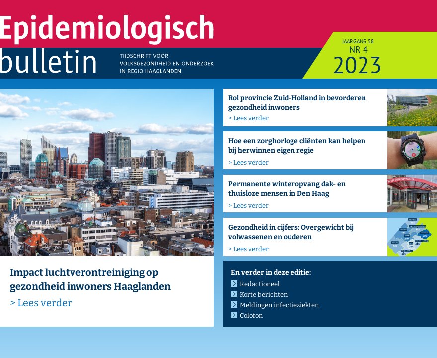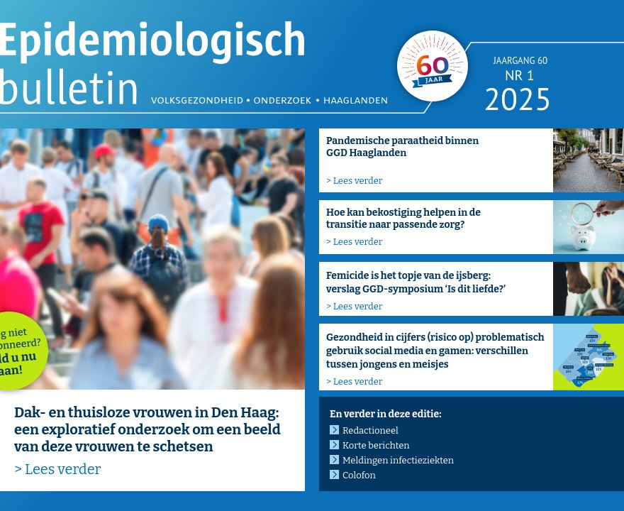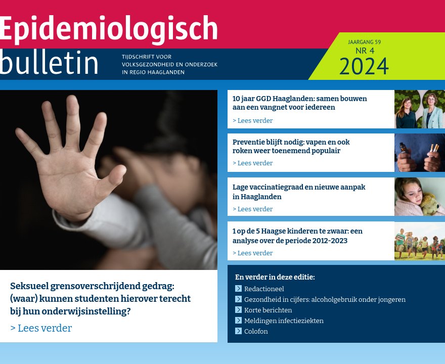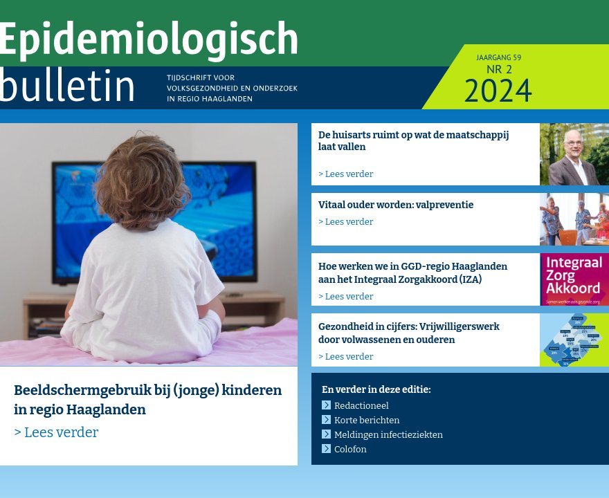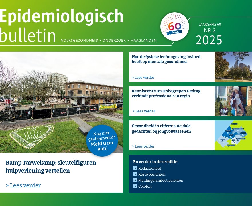 In deze editie: JAARGANG 60 NR 3 2025 Opgroeien in een Kansrijke Omgeving (OKO) voor jongeren in de gemeente Wassenaar > Lees verder Tuberculosebestrijding: ontwikkelingen en uitdagingen Regie over je kinderwens met het programma Nu Niet Zwanger Gezondheid in cijfers: vapen en roken door jongvolwassenen En verder in deze editie: > Lees verder > Lees verder > Lees verder Redactioneel Korte berichten Meldingen infectieziekten Colofon