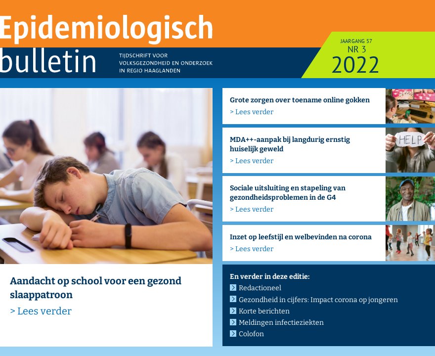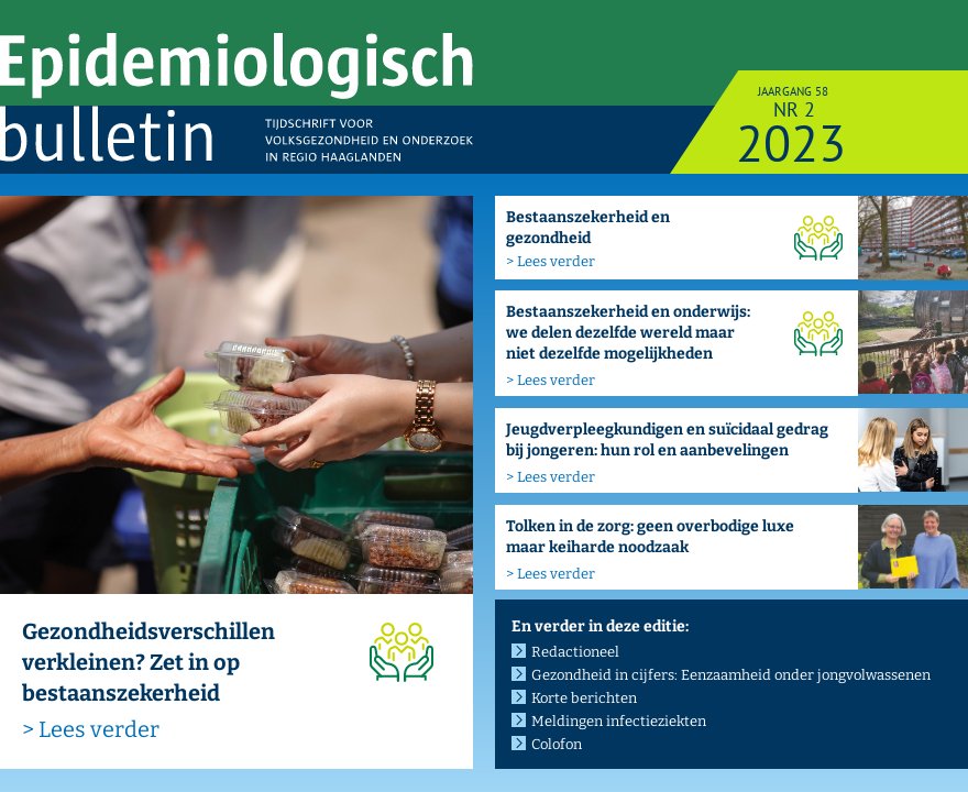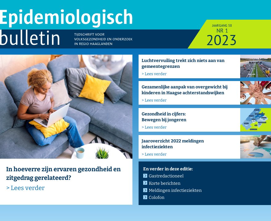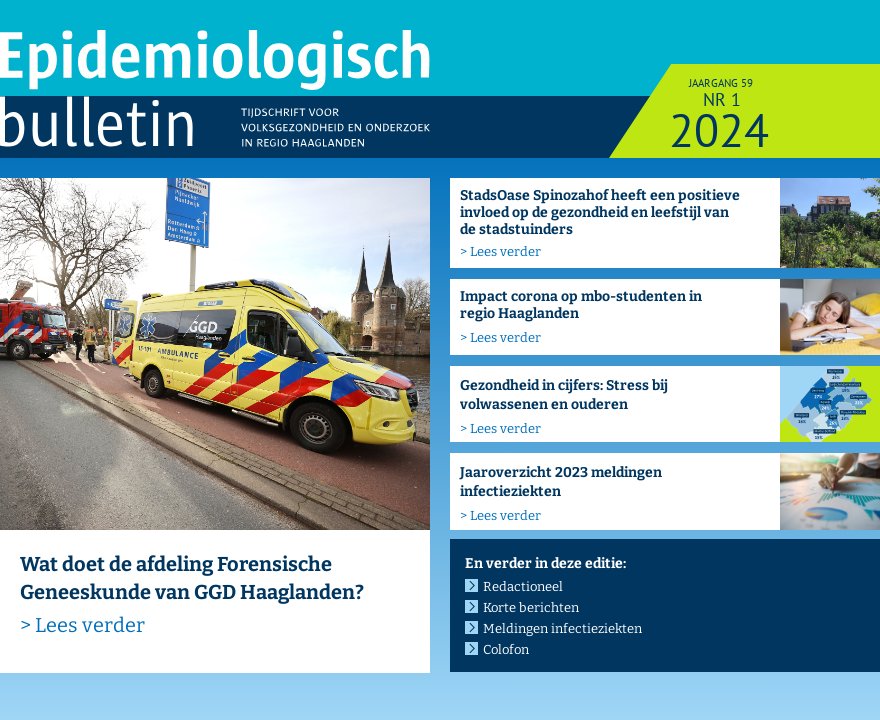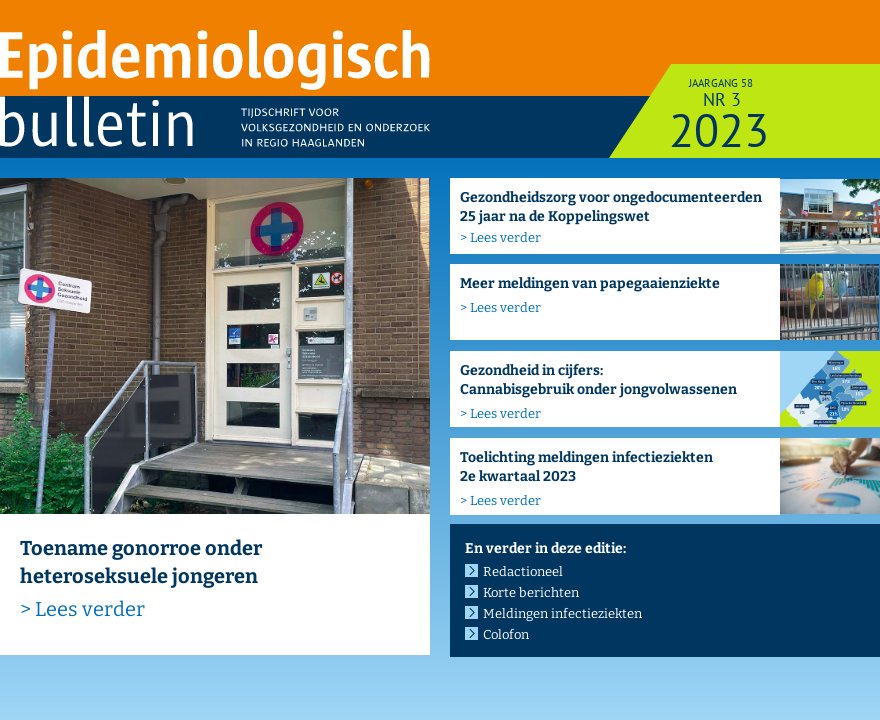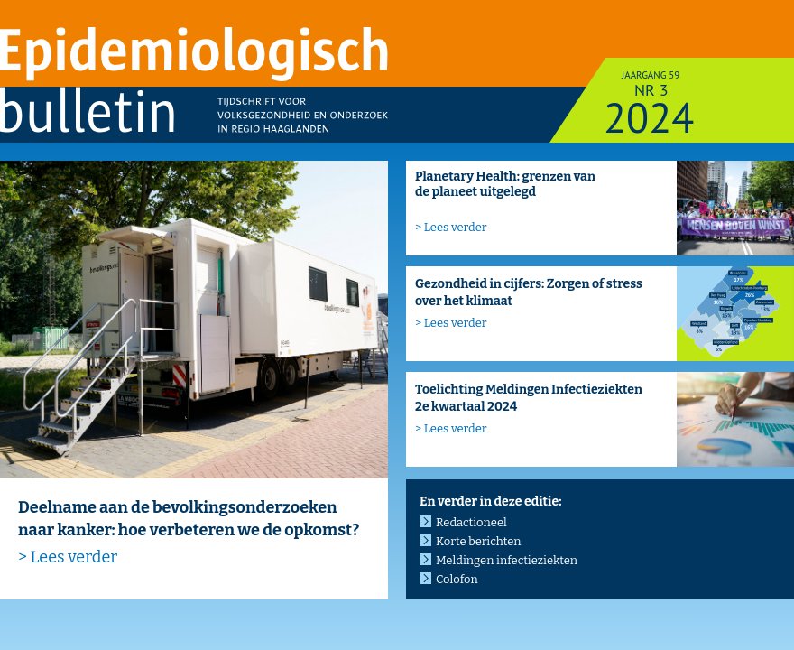 In deze editie: JAARGANG 60 NR 3 2025 Opgroeien in een Kansrijke Omgeving (OKO) voor jongeren in de gemeente Wassenaar > Lees verder Tuberculosebestrijding: ontwikkelingen en uitdagingen Regie over je kinderwens met het programma Nu Niet Zwanger Gezondheid in cijfers: vapen en roken door jongvolwassenen En verder in deze editie: > Lees verder > Lees verder > Lees verder Redactioneel Korte berichten Meldingen infectieziekten Colofon