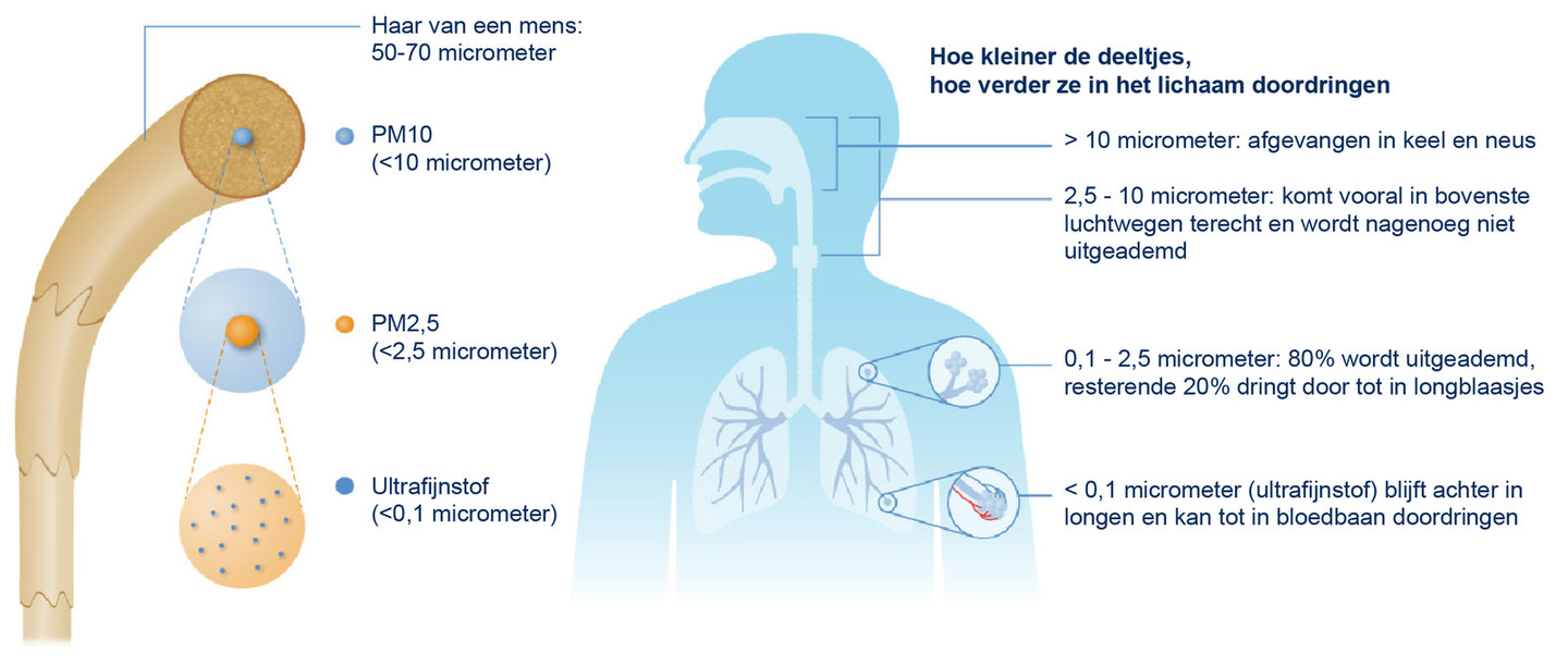 Fijnstof dringt diep door in het lichaam, waar het voor gezondheidsschade kan zorgen. Het zorgt er onder andere voor dat je longen minder goed werken en het is schadelijk voor het hart en het vaatstelsel. Bij mensen met hart- en vaatziekten, luchtwegklachten of longziekten, verergert het de klachten. Maar ook voor mensen zonder deze ziekten kan fijnstof zorgen voor gezondheidsklachten. In figuur 1 zijn de verschillende fijnstoffracties te zien en hoe diep deze doordringen in het lichaam.