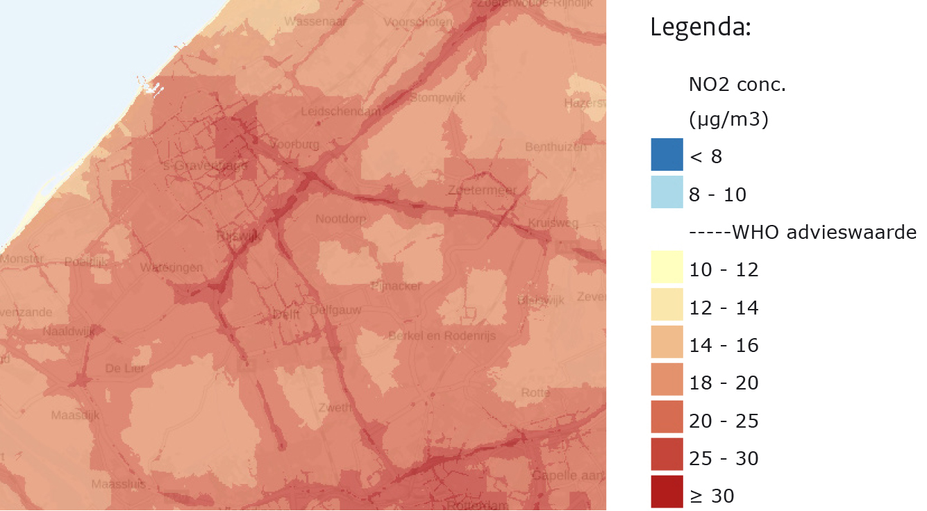 Regio Haaglanden is grotendeels verstedelijkt en heeft daarnaast een grote woningbouwopgave. Doordat de beschikbare ruimte beperkt is, verdichten de steden nog meer. Op onderstaande kaarten is te zien dat de concentraties stikstofdioxide (NO2) erg hoog zijn in de regio Haaglanden (figuur 2 en 3). Langs wegen en in stadskernen zijn de concentraties het hoogst. 5 Deze kaarten dateren weliswaar van 2019, maar zijn op dit moment het meest representatief. De nieuwste kaarten zijn van 2020, maar die geven vanwege de coronapandemie een vertekend beeld van de stikstofconcentraties.