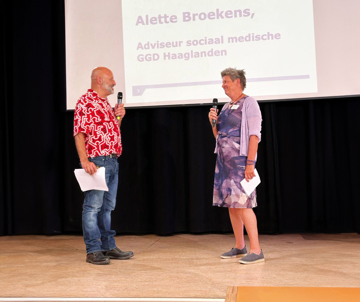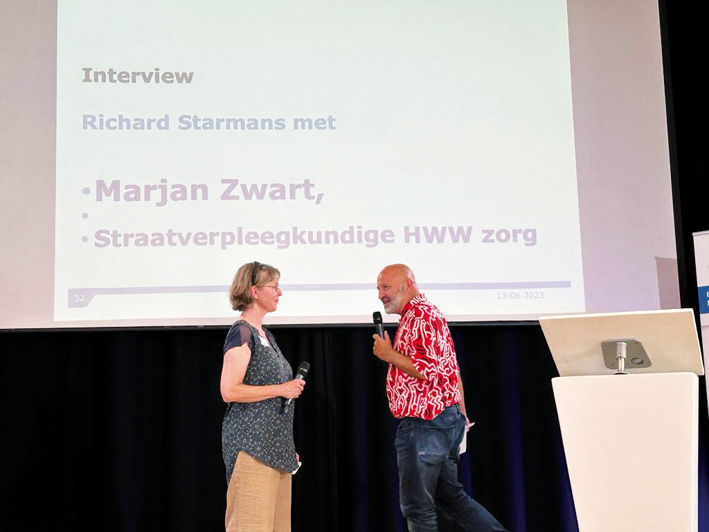 Eigenlijk zou Trudy Wijnia hier staan, maar zij kon helaas op het laatste moment niet meer. Gelukkig kon Marjan Zwart haar naaste collega vervangen. Marjan werkt nog maar kort als straatverpleegkundige bij HWW Zorg (Haagse Wijk- en Woonzorg), maar heeft desalniettemin veel ervaring met de doelgroep. Richard stelt haar dezelfde vraag die hij eerder aan Alette stelde: ‘Waar loop jij tegenaan vanuit jouw perspectief?’. Marjan: ‘Ik sluit me aan bij de obstakels die al door de vorige sprekers zijn genoemd. Praktisch gezien hebben wij vooral te maken met het tekort aan (straat)dokters waar wij de mensen naartoe kunnen verwijzen. Hoewel alle huisartsen verplicht zijn om die zorg te leveren, vindt een deel het te ingewikkeld. Niet alleen vanwege de administratieve rompslomp, maar ook omdat de zorg zelf heel complex is. Je hebt vaak te maken met een taalbarrière, ze komen vaak niet uit zichzelf en verdwijnen na een consult vaak weer van de radar. Terwijl een vervolg vaak noodzakelijk is. Dat maakt vaak dat we in samenwerking met bijvoorbeeld Streetlevel van het Leger des Heils en andere organisaties, constant en actief op zoek moeten naar deze mensen.’
