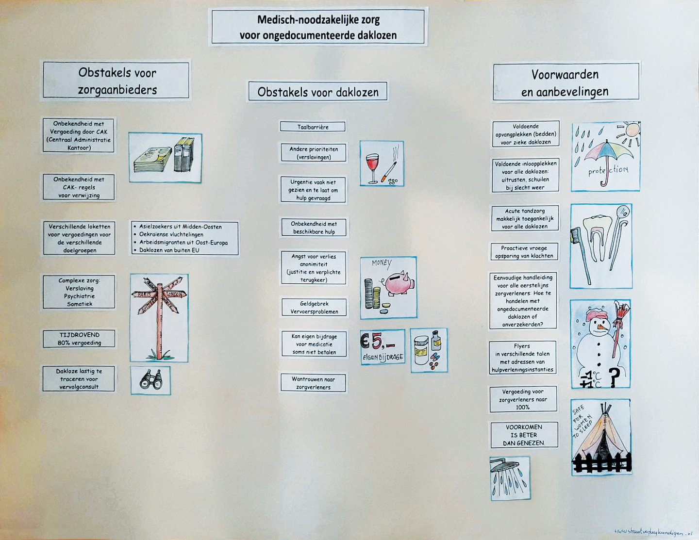 Obstakels en aanbevelingen t.a.v. medisch noodzakelijke zorg voor ongedocumenteerde daklozen: collage gemaakt door straatverpleegkundigen