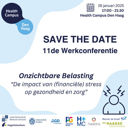 De centrale missie van de Health Campus Den Haag van de Universiteit Leiden is: bijdragen aan een gezonde levensverwachting voor iedereen. Hierbij staan 3 principes centraal: het verkleinen van gezondheidsverschillen, een duurzame benadering en een breed gezondheidsperspectief. Op 28 januari 2025 vindt van 17:00 - 21:30 uur de 11e werkconferentie van de Health Campus Den Haag plaats. Het thema is dit keer Onzichtbare belasting: de impact van (financiële) stress op gezondheid en zorg. Binnenkort worden het programma bekendgemaakt en de aanmeldlink gedeeld.