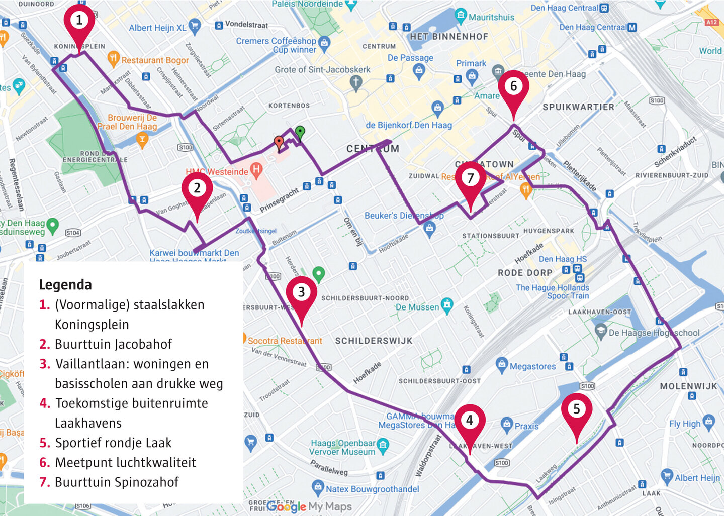 De afdeling Leefomgeving heeft ter inspiratie een fietsroute in Den Haag samengesteld. De route gaat langs locaties waar voorbeelden te zien zijn van hoe de leefomgeving positief of negatief bijdraagt aan mentale gezondheid. GGD Haaglanden heeft niet bij al deze voorbeelden een actieve rol (gehad). De route is ongeveer 8 km en duurt tussen de 45 en 60 minuten.